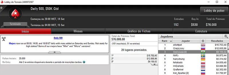 O maior resultado apareceu com a medalha de bronze de Deputado1414 que forrou $18,187 no Bounty Builder High Roller. O torneio contou com 603 entradas e distribuiu $301,500 de prize pool.