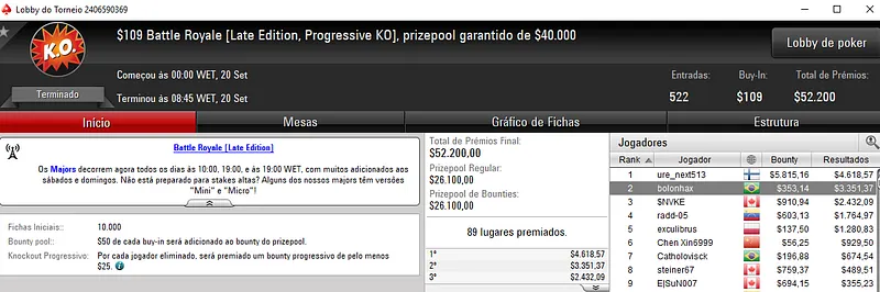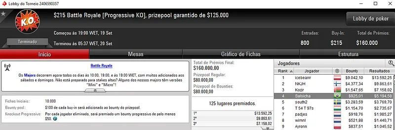 Já no $22 Mini Battle Royale, guigo castro foi o mais forte e embolsou $8,406, entre prêmio e bounties. Participaram neste evento 4,294 jogadores que perfizeram um prize pool acumulado de $85,880.
