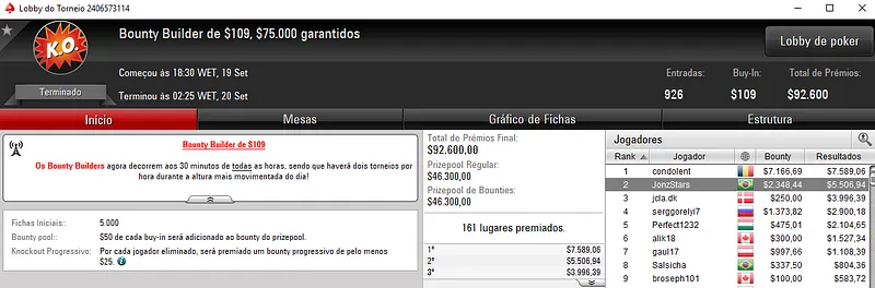 JonzStars também saiu com uma boa forra e embolsou $7,854 no Bounty Builder $109 com 926 participantes. Aqui, o prize pool chegou aos $92,600.