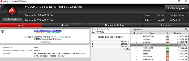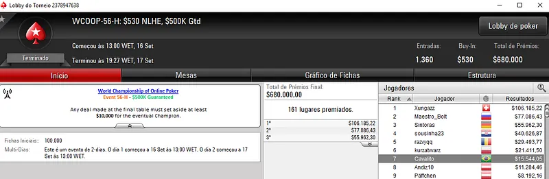 A maior premiação apareceu com a medalha de prata de Any2vsYou no WCOOP #57-Medium: $215 NLHE [8-Max, Sunday Warm-Up SE] que acolheu $4,233 entradas. O prie pool deste evento chegou nos $846,600, com o jogador verde e amarelo a faturar $85,488 de premiação. Luizftorres foi oitavo e teve direito a $10,686.