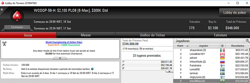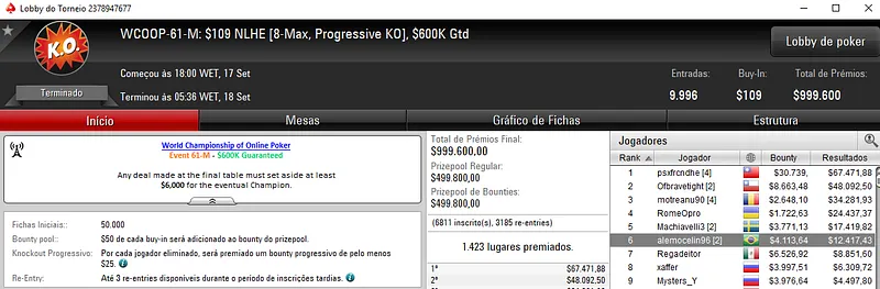 Já no WCOOP #57-High: $2,100 NLHE [8-Max] foi Thiago "KKremate" Crema que deu show e embolsou $65,313 de premiação pelo quinto lugar entre os 667 participantes. Este torneio distribuiu $1,334,000 pelos 87 melhores colocados.