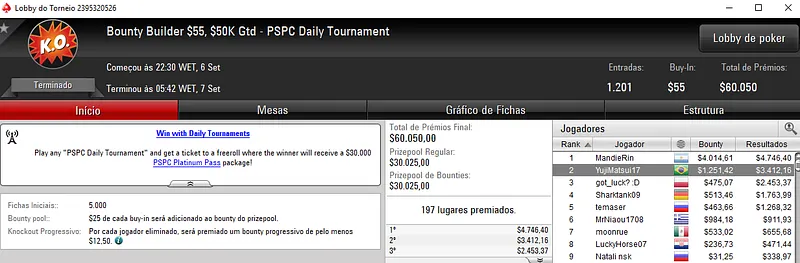 Já no Daily Marathon, o Brasil teve 3 representantes no top 5 deste evento. Geraldo "GeraldoCesar" Neto foi segundo colocado e embolsou $10,656 depois de fazer acordo no heads-up. Na terceira colocação, guirib8ir0 faturou $6,130, enquanto KKing James recebeu $4,302 na posição seguinte. Este torneio acolheu 1,726 entradas que se traduziram em $86,300 de prize pool.