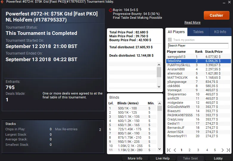 Ainda com um grande forra, whresmymind embolsou $12,700 no Powerfest #70-High com 984 entradas. Este torneio distribuiu $200,000 pelos 132 melhores classificados.