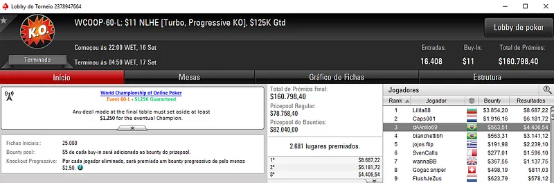 Régis "capotinha" Kogler e Bruno "great dant" Volkmann atingiram a mesa final do WCOOP #60-High: $1,050 NLHE [Turbo, Progressive KO] e receberam $18,417 e $17,634 pelo sétimo e oitavo lugar, respectivamente. O prize pool deste evento chegou aos $1,264,000, onde foram registadas 1,264 entradas.