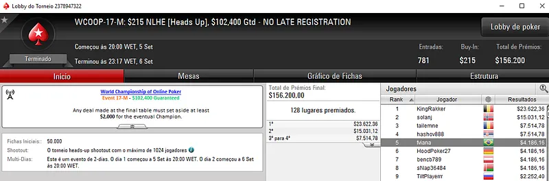 Já nova medalha de ouro apareceu com a dobradinha verde e amarela no WCOOP #17-Low: $22NHLE [Hedas-Up] com 3,897 entradas. Na primeira colocação, andresdos forrou $8,212, enquanto RikAAk recebeu $5,224 em segundo.