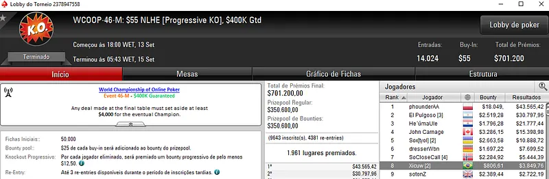 No WCOOP #48-Low: $11 NLHE com 7,760 entradas, leandroctbsb foi o maios forte e embolsou $10,719 de premiação. Para trás ficou Gustavo "vascaodf" Lopes que recebeu $7,413 pela segunda colocação. Este evento repartiu $76,048 pelos 1,295 melhores classificados.