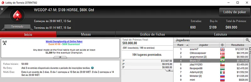 Gustavo "vascaodf" Lopes ainda faturou a maior premiação do dia ao terminar o WCOOP #48-Medium: $109 NLHE também na segunda colocação. Aqui, o jogador brasuca forrou $21,685 entre os 287 jogadores que dividiram o prize pool de $203,300. Caio "Pessagno" Pessagno terminou em terceiro e encaixou $15,457, enquanto na quinta colocação, aldo drogba recebeu $11,018.