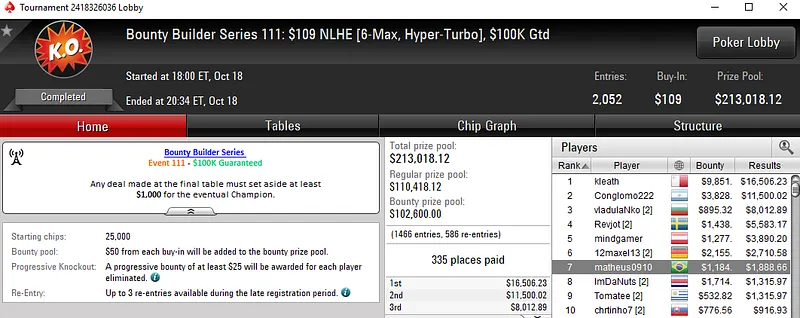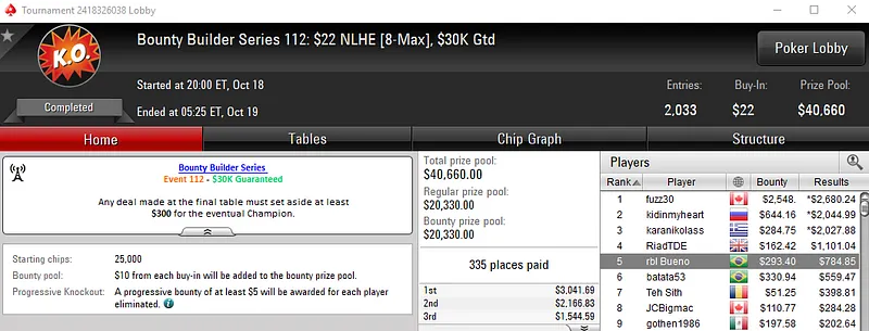 A sessão de ontem trouxe mais um título nacional na Bounty Builder Series do PokerStars. Os grinders nacionais continuam tentando sua sorte nesta nova série de torneios online e até agora o balanço é bastante positivo.