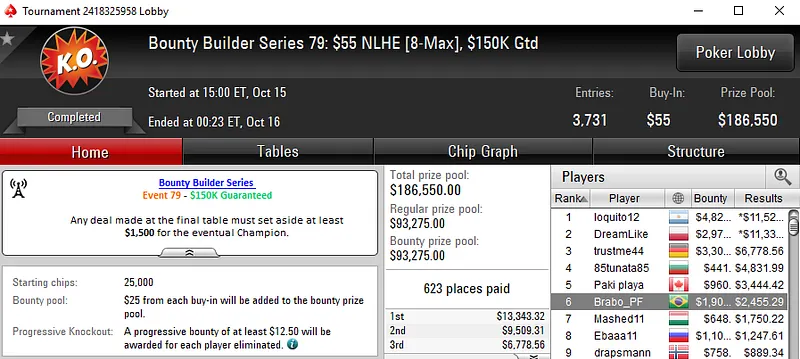 Pablo "pabritz" Brito Silva foi mesmo o grande vencedor do dia ao conquistar o Bounty Builder Series #77: $530 NLHE com 532 entradas. O prize pool deste evento atingiu os $266,000 e o craque nacional encaixou $40,106 de premiação pelo excelente desempenho.