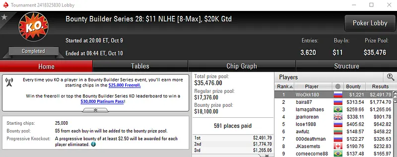 O segundo título apareceu com a vitória de XxMedeiRosxX no Bounty Builder #26: $22 NLHE. Este evento contou com 8,692 entradas que se traduziram em $173,840 de prize pool. A medalha de ouro valeu $16,306 e Rafael "RafaCorreaBR" Correa ainda recebeu $3,269.