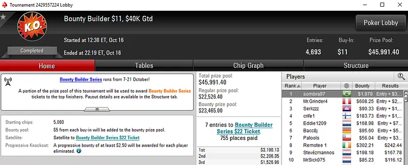 O jogador que esteve mais perto desse feito foi FábioC.p.br que terminou o $215 Fat Tuesday na segunda colocação. A medalha de prata valeu $9,661 de premiação entre as 339 entradas registradas. Este evento distribuiu $67,800 pelos 54 melhores classificados.