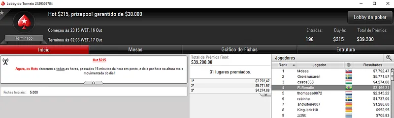 FábioC.p.br Segundo Colocado do Fat Tuesday do PokerStars & Mais