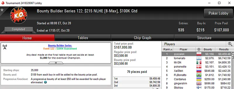 Já fuàallin não deu chances às 12,959 entradas registradas no Bounty Builder Series #123: $5,50 NLHE e forrou $5,541, entre prêmio e bounties. Este torneio contou com um prize pool acumulaod de $63,499.