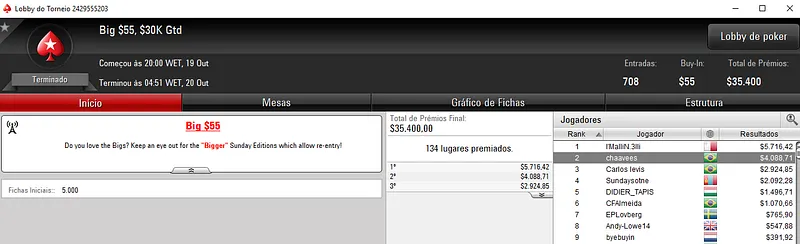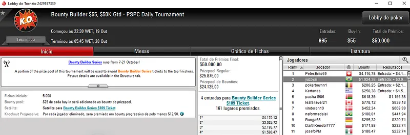 A medalha de prata no Bounty Builder $215 ainda rendeu $6,179, entre prêmio e bounties a tochetto885. Com 224 entrads este evento distribuiu $50,000 de prize pool.