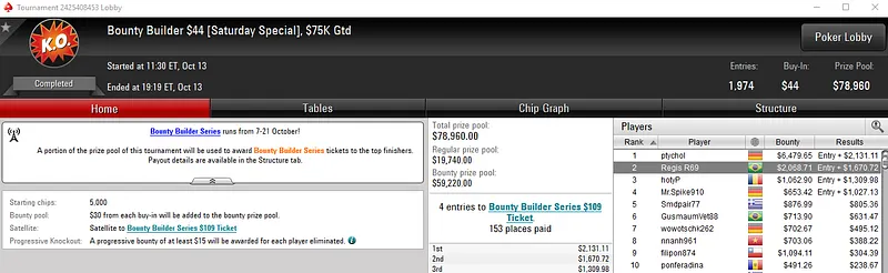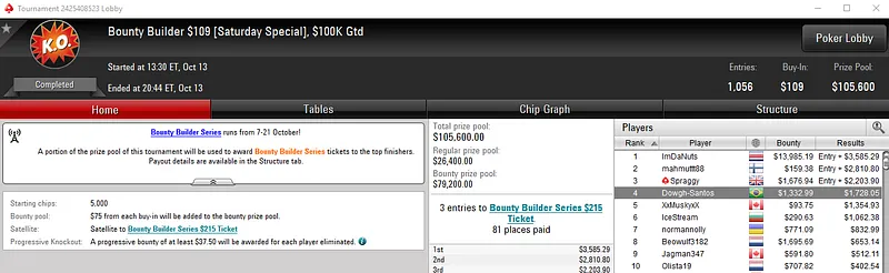 A maior forra veio com a vitória de Pablos701 no $27 Saturday Eliminator com 3,457 entradas. O prie pool deste evento chegou aos $84,869, com o jogador brasileiro a embolsar $10,071 de premiação.