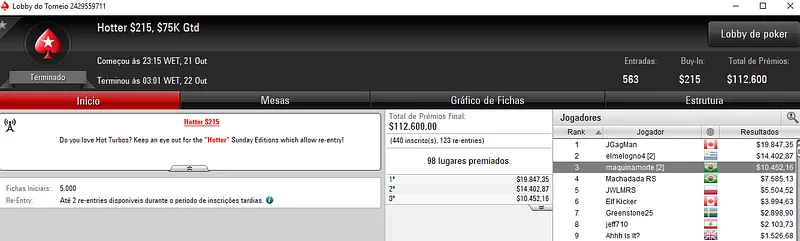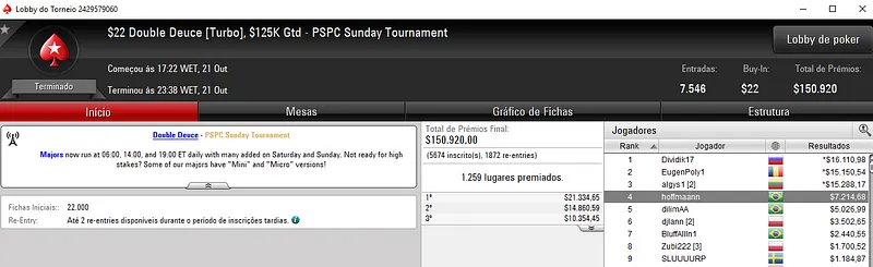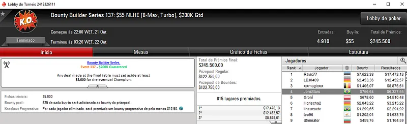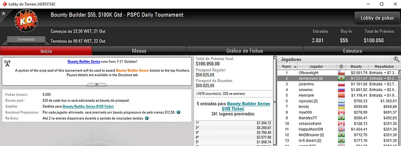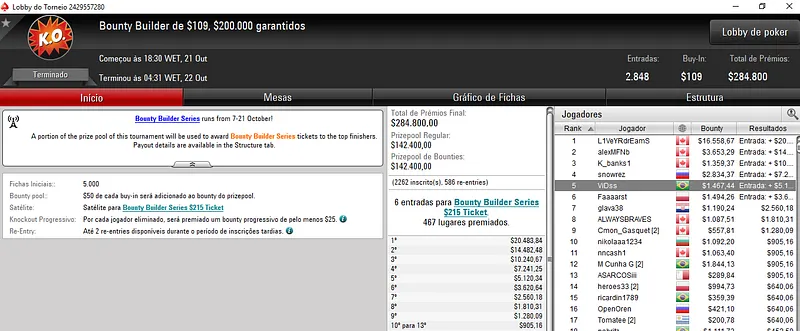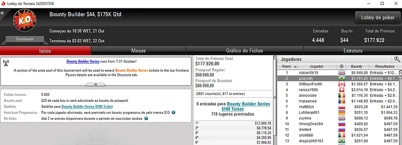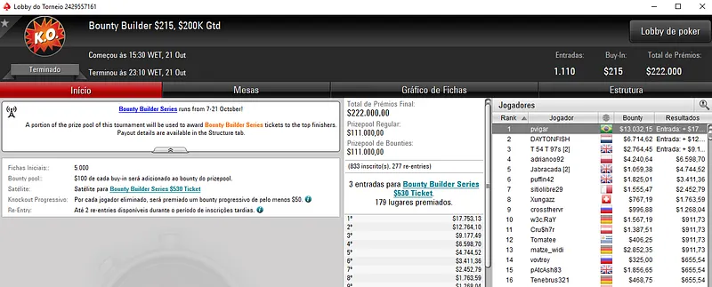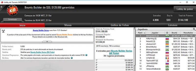 Já no Bounty Builder $162, Guilherme deixou para trás o field com 458 entradas e embolsou mais $12,623, entre prêmio e bounties. Aqui, o segundo lugar ficou para gabsdrogba que fez acordo no heads-up e embolsou $5,894 de premiação. Este evento teve um prize pool de $68,700.