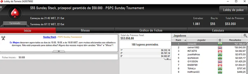 Guilherme "VinceVegaMFR" Cheveau deu show e conquistou dois importantes torneio da sala. A maior forra apareceu com a vitória no Sunday Warm-Up com 1,139 jogadores. O craque brasuca não deu chances e levou para o caixa $36,006 dos $227,800 de prize pool acumulado. A medalha de bronze ainda valeu $18,613 a Pablo "pabritz" Brito Silva e na colocação seguinte, edudrake1987 recebeu $13,383.