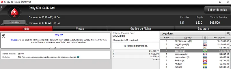Confira aqui quem mais faturou na reta de ontem do PokerStars: