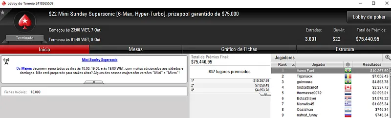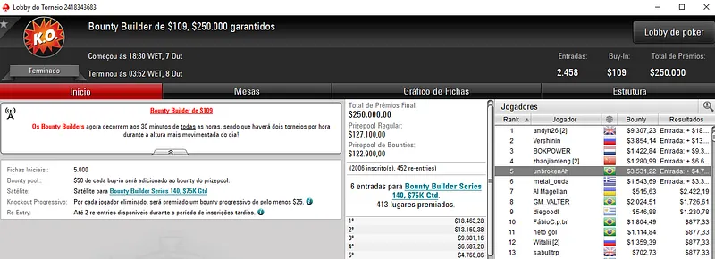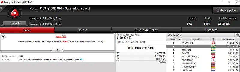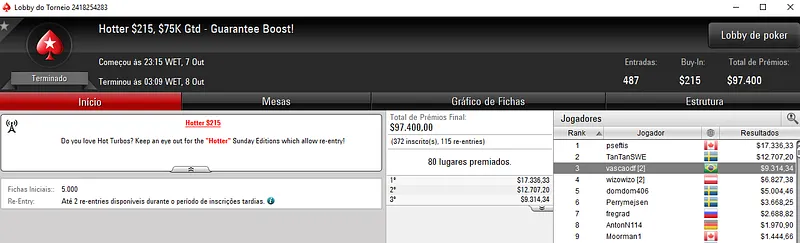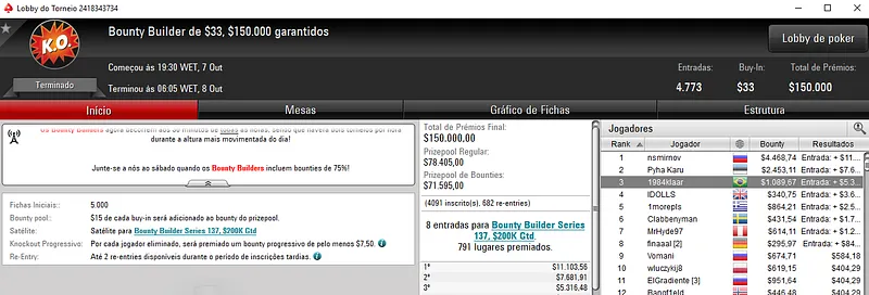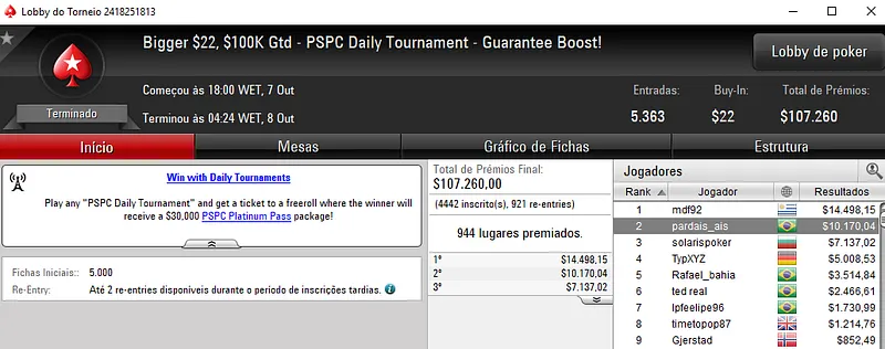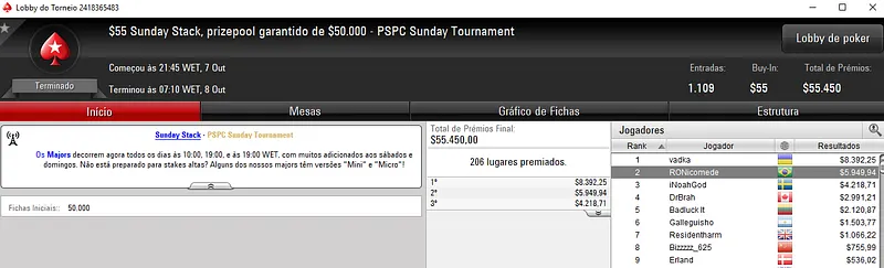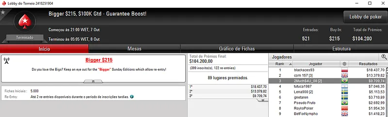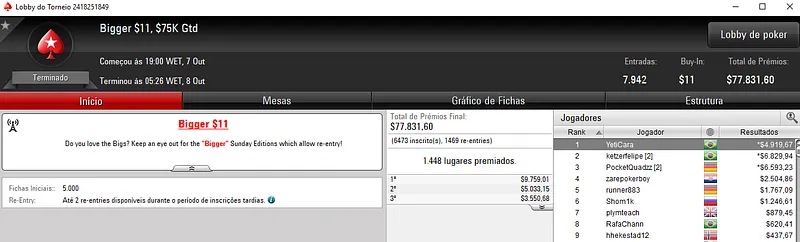 Já no $11 Sunday Storm, rekkster89 foi segundo classificado entre as 21,623 entradas registradas e embolsou $14,322 de premiação. Na quinta colocação, bremp555 teve direito a $4,657 dos $225,000 distribuídos.