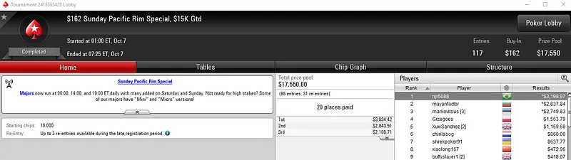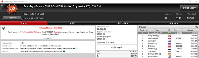 O grande campeão foi reyals_rs que deixou para trás os 285 adversários no Bounty Builder $162 e forrou $9,578, entre prêmio e bounties. O torneio teve um prize pool acumulado de $42,900.