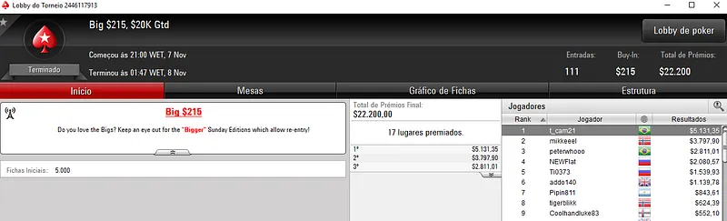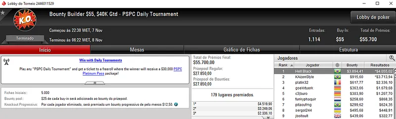 Com a conquista do $22 Mini Battle Royale com 4,380 participantes, bettercsaul levou para o caixa cerca de $10,297, entre prêmio e bounties. Este torneio acumulou $87,600 de prie pool.