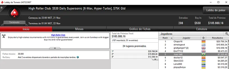 O maior resultado apareceu com a vitória no High Roller Club: $1,050 Daily Warm-Up com 109 entradas. O jogador nacional não deu chances ao field e levou para o caixa $25,117 dos $109,000 de prize pool distribuído pelos melhores 13 classificados.