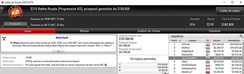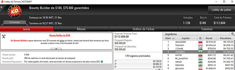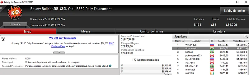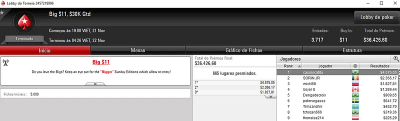 Para terminar, Cassio ainda recebeu $4,713 no High Roller Club: $530 Bounty Builder HR. Com 359 entradas, este evento distribuiu $179,500 de prize pool. O jogador verde e amarelo terminou em 11º e viu Renan "Internett93o" Carlos Bruschi receber $16,273 na segunda colocação. Diego "Mr.Bittar" Bittar terminou em quarto para $8,830, enquanto k9 romeu foi oitavo e embolsou $3,185.