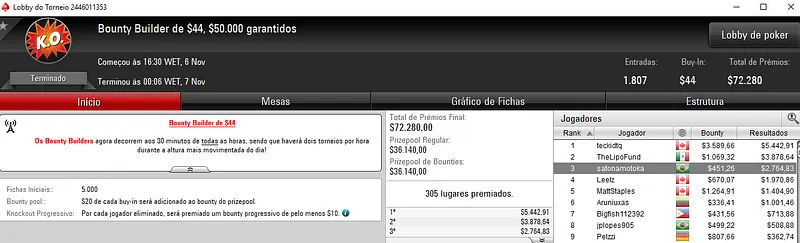 Também na quarta colocação do $215 Fat Tuesday, Sabioni encaixou mais $4,983 de premiação. Aqui, forma registradas 302 entradas e o prize pool de $60,400 foi repartido pelos 45 melhores classificados. Em quinto, Pablo "pabritz" Brito Silva levou para o caixa cerca de $3,442 de recompensa pelo desempenho.
