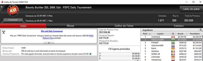 Já Saulo "sgsabioni" Sabioni amealhou dois grandes resultados na reta de ontem. O craque somou $7,191 de premiação no High Roller Club: $530 Daily 500 com 148 entradas. Este torneio distribuiu $74,000 pelos 17 melhores classificados.