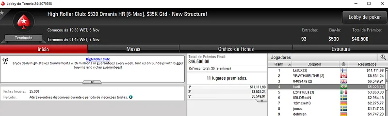 Cassio "cassiopak" Killes foi que se deu melhor ao terminar o High Roller Club: $1,050 Super Tuesday com 198 entradas na quinta colocação. O jogador verde e amarelo levou para o caixa cerca de $12,956 de premiação.