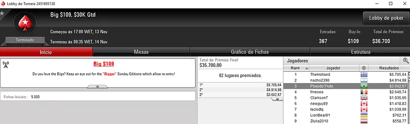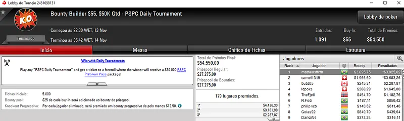 Já no Bounty Builder $44, o melhor classificado foi HoffmannGC que faturou $9,519 de premiação. O torneio com 1,788 participantes teve um prize pool acumulado de $71,520.