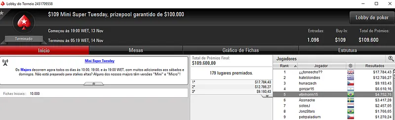 O High Roller Club: $1,050 Super Tuesday contou com 155 jogadores, onde o prize pool de $155,000 foi distribuído pelos 17 melhores classificados. Cassio embolsou $15,062 de premiação pelo desempenho.