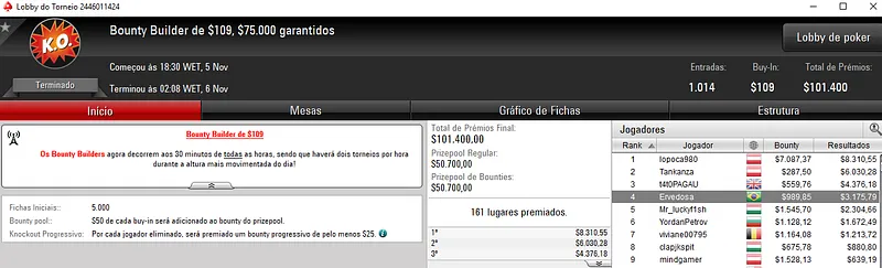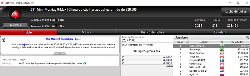 Um desses jogadores foi edu22.sp que terminou na quinta colocação do $1,050 Monday 6-Max [High Roler] com 123 entradas. O jogador brasileiro caiu na quinta colocação e forrou $9,567 de premiação. Este evento distribuiu $123,000 pelos 14 melhores classificados.