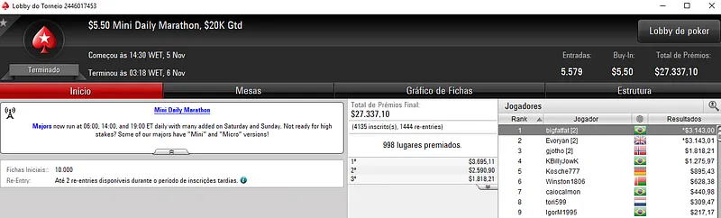 A medalha de bronze de edsonluizjr ainda valeu $6,424 de recompensa no $22 Mini Monday 6-Max com 4,645 entradas. Aqui, o prize pool chegou aos $92,900, onde 767 jogadores saíram com premiação.