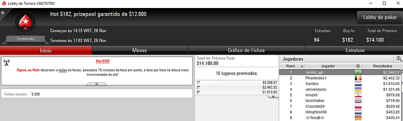 Já guiilhermex’ cravou o Hot $11 para levar para o caixa cerca de $4,417 de premiação. Este evento com 3,589 jogadores contou com um prize pool de $35,172, onde 665 saíram com prêmios.