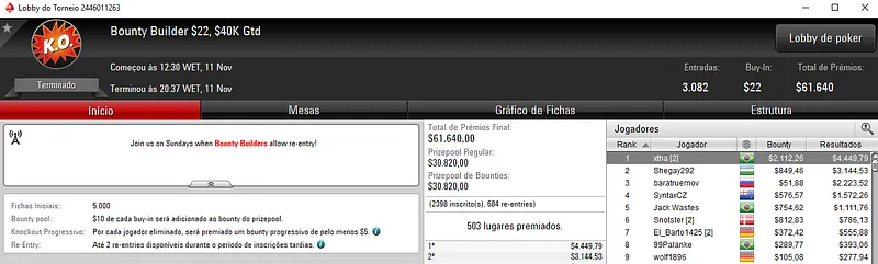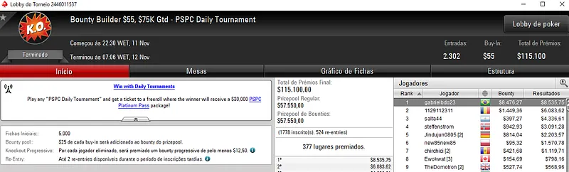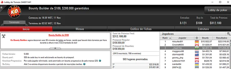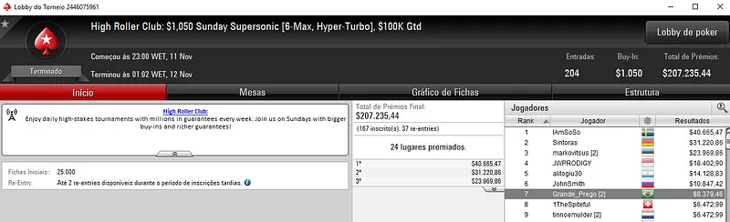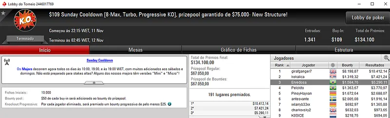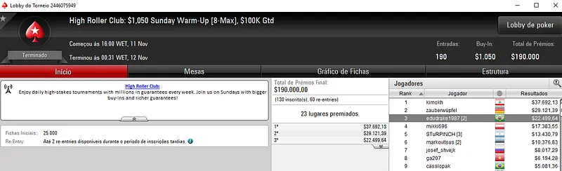 Quem também brilhou na reta de ontem foi o craque Kelvin "Kelvin_FP:AR" Kerber que se sagrou campeão do High Roller Club: $2,100 Sunday Cooldown com 113 entradas. O prize pool deste torneio chegou nos $226,000, com o brasileiro a faturar $69,539, entre prêmio e bounties. Na quarta colcação, edu22.sp levou para o caixa $12,812.