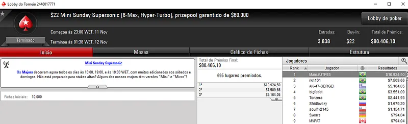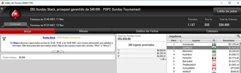 O eventod e ontem contou com 5,695 entradas, onde o prize pool acumulado de $1,139,000 acabou por ser repartido pelos 998 melhores classificados. O jogador nacional terminou na terceira colocação e por isso faturou $75,755 de premiação. Já o sexto lugar deu $26,181 a André "Pardal77" Lichtenstein pelo desempenho.