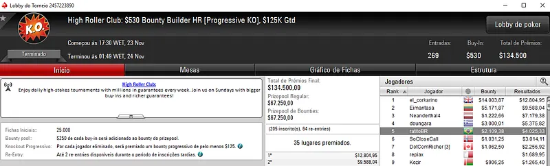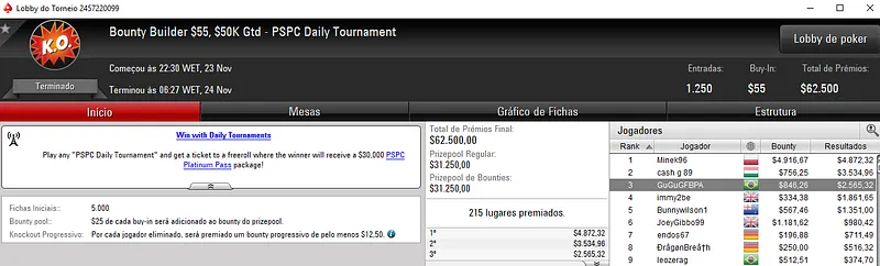 Já no High Roller Club: $1,050 Fast Friday, o brasuca acumulou mais uma mesa final e forrou $6,558 pela sexta colocação. Aqui foram registradas 96 entradas, onde o prize pool distribuído foi de $100,000.