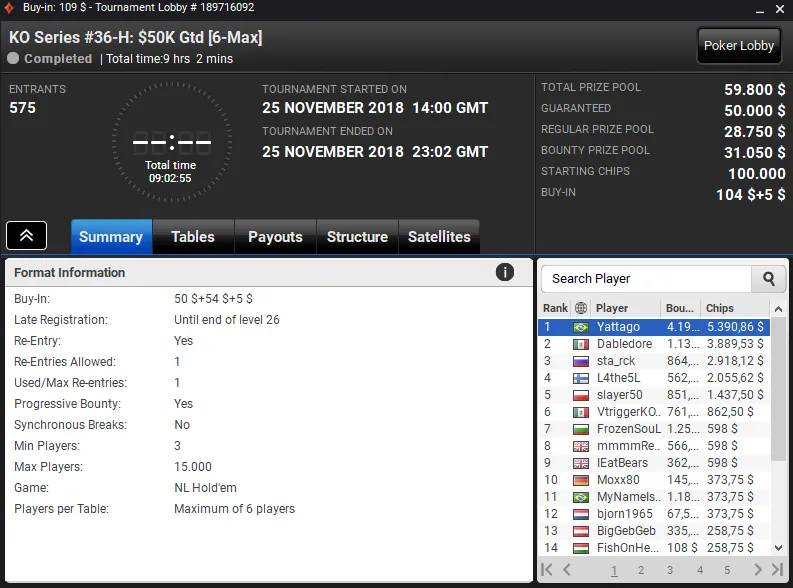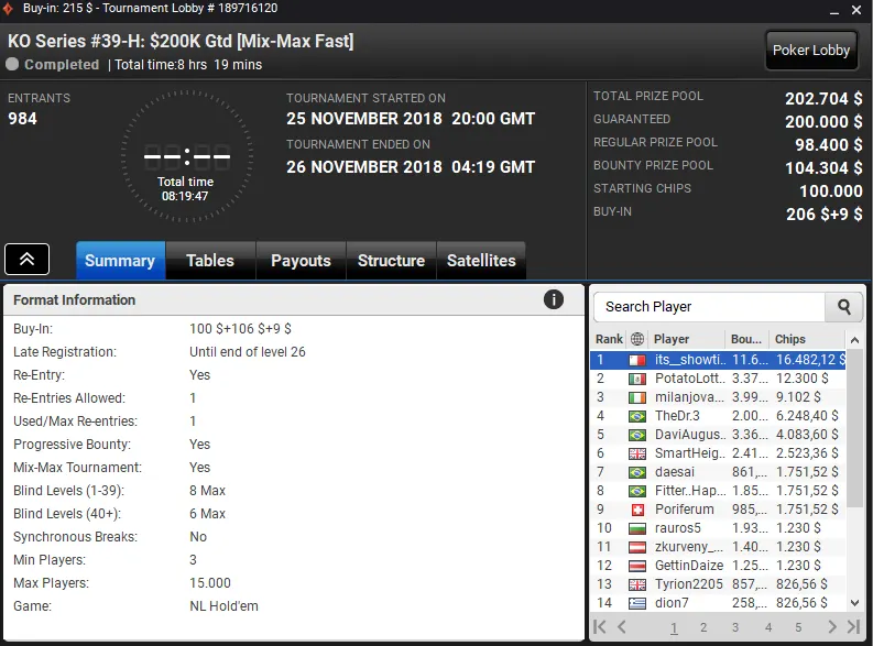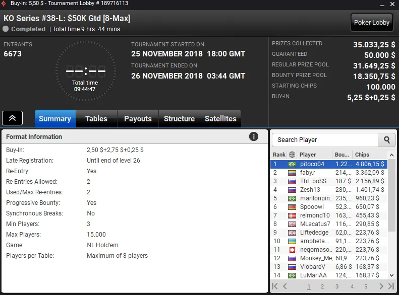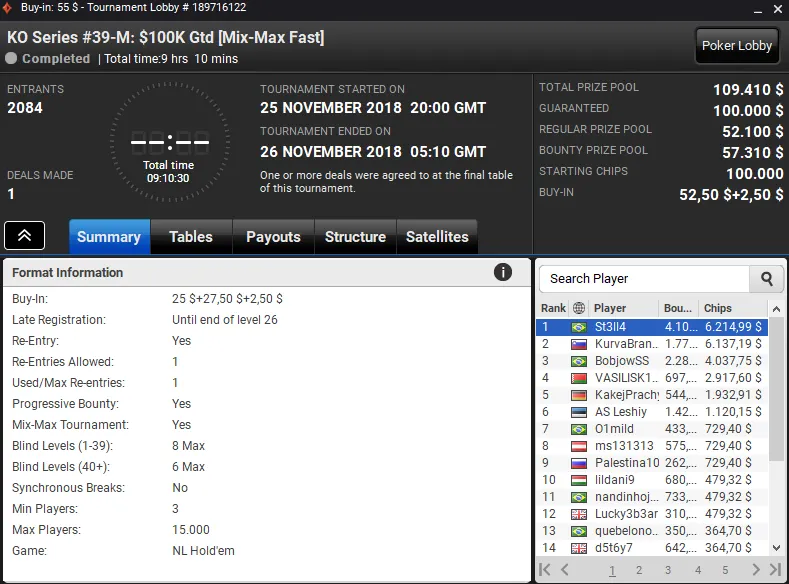 Já no KO Series #40-High, o jogador brasileiro fez bonito e forrou mais $11,010, entre prêmio e bounties. Este torneio contou com 598 entradas e o prize pool repartido chegou nos $62,192.