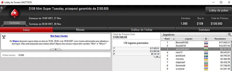 O High Roller Club: $1,050 Super Tuesday acolheu 142 entradas e viu o prize pool garantido de $150,000 ser distribuído pelos 17 melhores classificados. Gustavo "gustavo5454" Hoffman foi o melhor jogador nacional e caiu na quarta colocação para receber $14,576 de premiação.