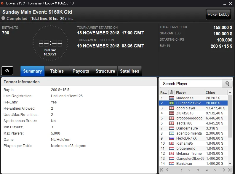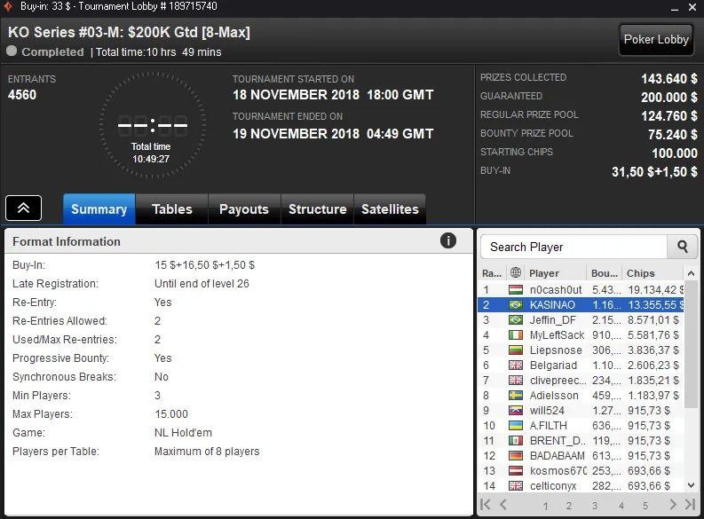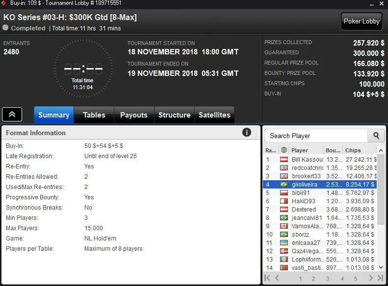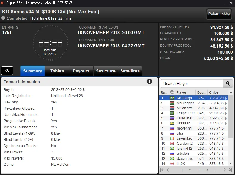 Pablo "Britz1" Brito Silva foi o grande vencedor da sala de poker online ao conquistar o KO Series #02-H com 1,042 entradas. Este torneio repartiu $214,652 de prize pool e o jogador nacional embolsou $26,939 de premiação.