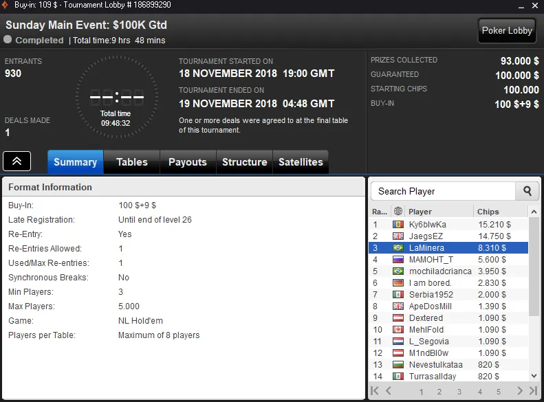 Com a medalha de prata no Sunday Main Event High Roller, whresmymind levou para o caixa cerca de $25,917 de premiação. Este torneio acolheu 163 entradas que se traduziram num prize pool de $163,000.