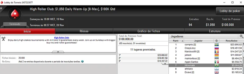 Rafael "GM_VALTER" Moraes foi o grande vencedor do dia ao terminar o High Roller Club: $530 Bounty High Roller na segunda colocação. O craque nacional faturou $15,169, entre prêmio e bounties neste torneio que contou com 312 entradas e onde o prize pool chegou aos $156,000.