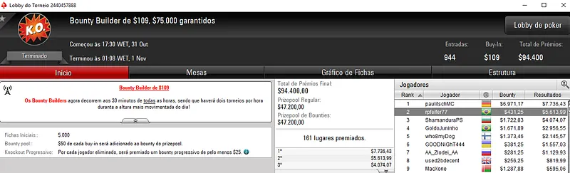 Já no $215 Battle Royale também houve cravada nacional com Bruno "botteonpoker" Botteon a faturar $24,488, entre prêmio e bounties. Este evento contou com 843 participantes e o prize pool chegou nos $168,600. Na quinta colocação, mtagliari ainda embolsou $4,358 de recompensa.