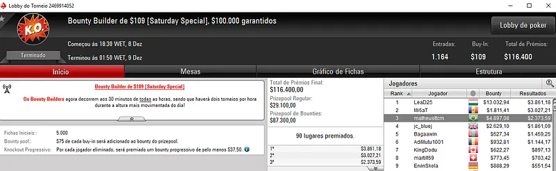 Já no Bounty Builder $162 houve dobradinha brasileira. Joseph "Joe Santana" Santana saiu campeão e levou para o caixa $9,511 de premiação. Para trás ficou NADAcomNADA que ainda faturou $2,695 dos $42,300 distribuídos.