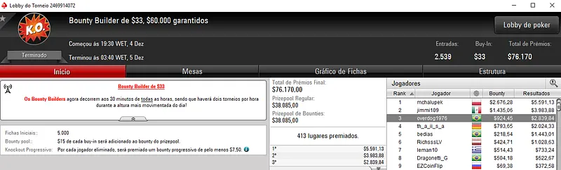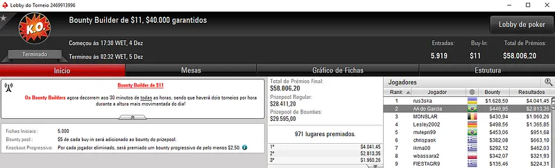 Já no High Roller Club: $530 Bounty Builder HR foram registradas 468 entradas, com o prize pool a subir aos $234,000. Com a medalha de bronze, Danulla10 saiu com $13,497, entre prêmio e bounties. Na posição seguinte, Diego "Mr.Bittar" Bittar também foi feliz e embolsou $13,791.