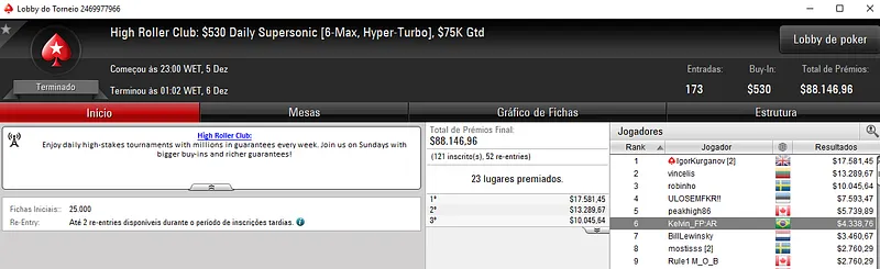 Já no High Roller Club: $530 Daily 500, Diego levou para o caixa mais $5,430 de premiação. Aqui, o jogador nacional terminou na quarta colocação entre as 98 entradas registradas. Este evento repartiu $50,000 pelos 11 melhores classificados.
