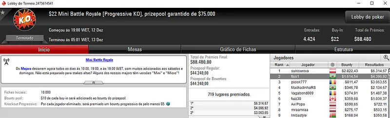 Já no High Roller Club: $1,050 Daily Cooldown, kartt ainda forrou mais $4,794 pelo novo quinto lugar. Aqui, Mateus "pimenta7" Pimenta foi terceiro e embolsou $10,434, entre prêmio e bounties. Com 93 entradas, este torneio distribuiu o prize pool garantido de $100,000.