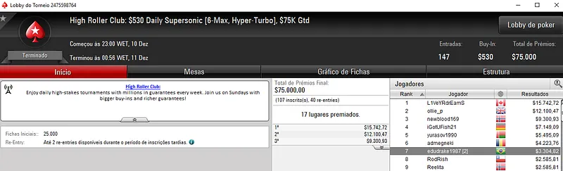Já no $215 Monday 6-Max com 520 entradas, Dante "dantegoyaF" Goya teve um bom desempenho e embolsou $4,337 pelo quinto lugar. Este torneio distribuiu $104,000 de prize pool pelos 89 melhores classificados.