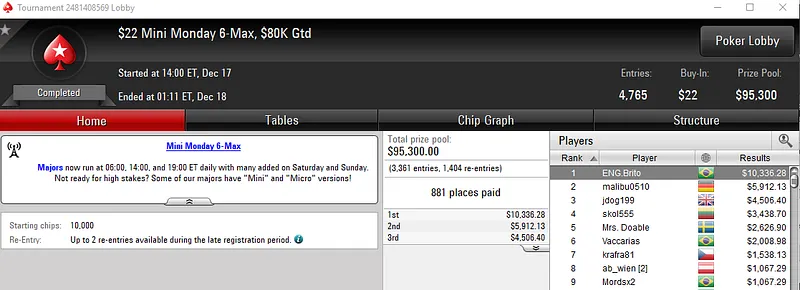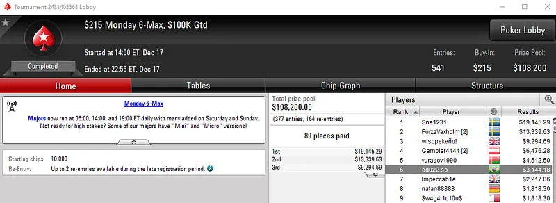Confira aqui quem mais faturou na reta de ontem do PokerStars: